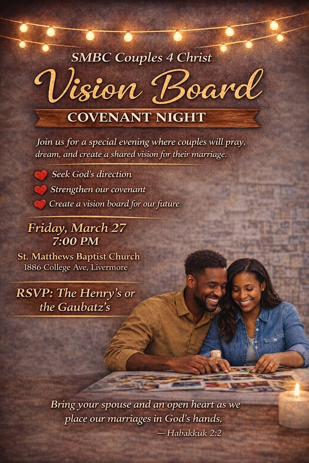 march, 2026 27mar7:00 pm9:00 pmCouples Vision & Covenant Night Time(Friday) 7:00 pm - 9:00 pm Organizer Elder Derrick Henry & Sis. Amiee Henry