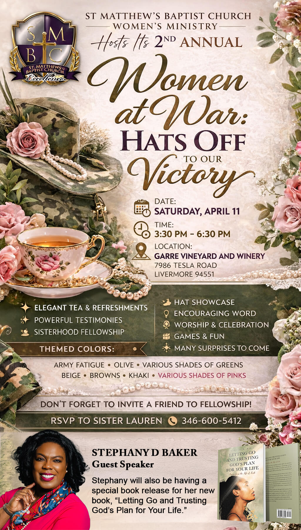 april, 2026 Garré Vineyard, Restaurant, & Event Center7986 Tesla Rd 11apr10:00 amWomen at WarHats Off to Our Victory Time(Saturday) 10:00 am LocationGarré Vineyard, Restaurant, & Event Center7986 Tesla Rd Organizer Sis. Lauren Carmon(346) 600-5412